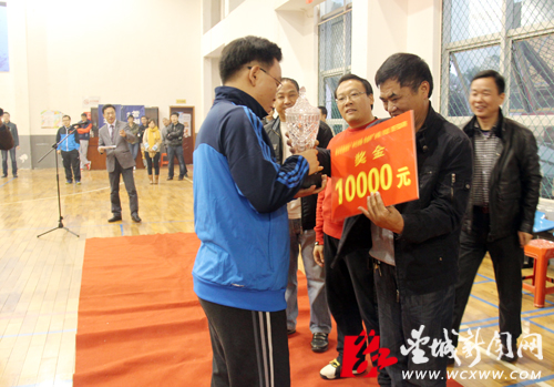 区领导、区篮球协会会长高潮为白沙洲代表队颁奖。(刘赛 摄)