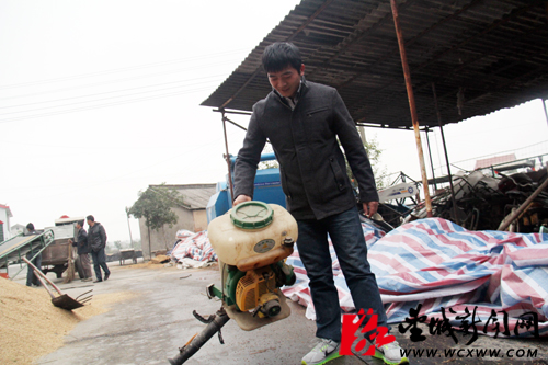 袁虎刚种田时用的背包式汽油喷雾器,当时每天要喷药三四十余亩农田。(刘赛 摄)