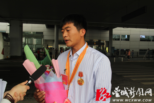 从北京领回“中国青年五四奖章”的袁虎刚下飞机就将接受了家乡媒体采访,说到动情处不禁哽咽。(刘赛 摄)