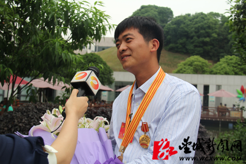 鲜花、荣誉、掌声扑面而来,如今的袁虎已经能自如的面对媒体镜头。(刘赛 摄)