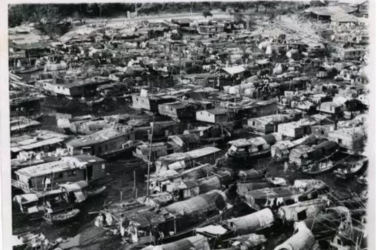 1938年香港港湾里乞讨者们将一艘邮轮团团围手持带网兜长杆乞讨