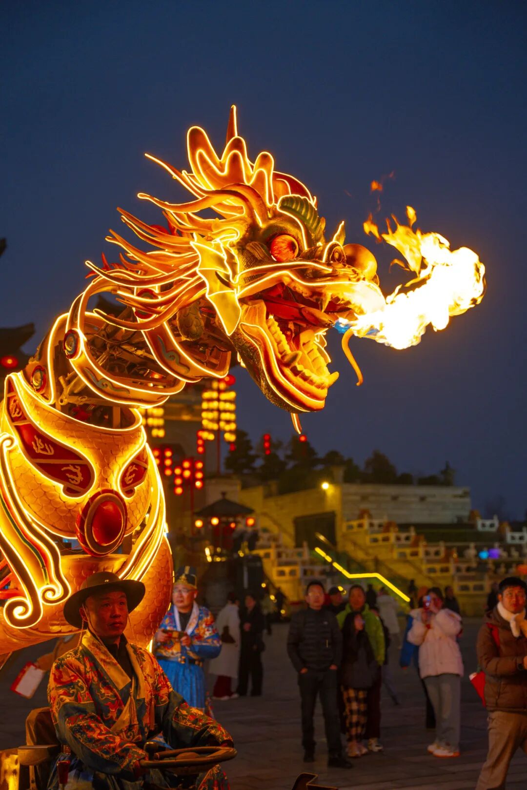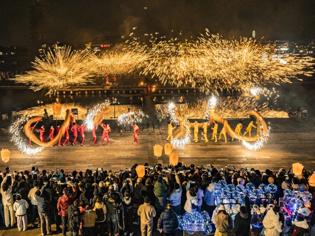 夜幕降临,园区“超级大夜场”更显璀璨。火龙钢花率先登场,1600℃铁水化作漫天星雨,让游客近距离感受非遗魅力。随后千架无人机腾空而起,组成“天马行空”“铜官纳福”等动态图景,将新年祝福写满天际。游客手持专属孔明灯,在指定区域放飞祈福,千灯万盏与盛唐街景如梦似幻。